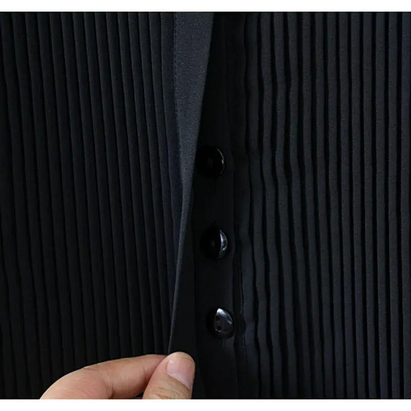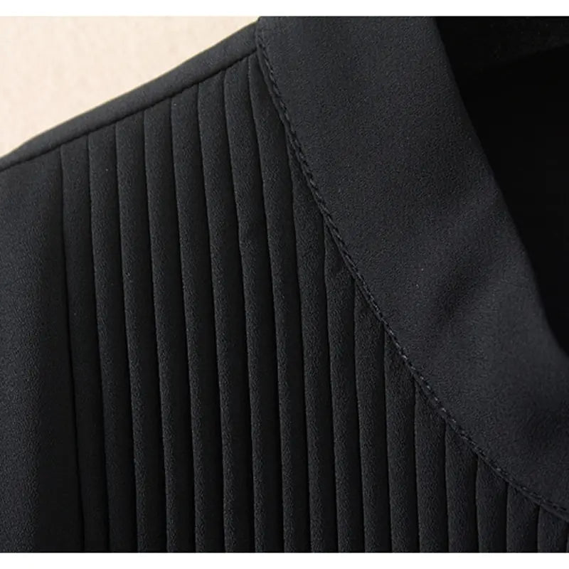 The front pleated design and long sleeves create a sophisticated look that's perfect for the office or any formal setting. Crafted from premium chiffon, this bodysuit drapes beautifully, ensuring a flattering fit that moves with you throughout the day. Say goodbye to constant adjusting and hello to all-day confidence!